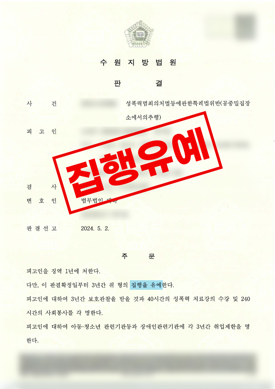 이와 같은 종합적인 자료와 사정들을 법원에 꾸준히 제출하고 설명한 결과, 실형 선고가 유력해 보였던 사건에서 의뢰인은 징역 1년에 집행유예 3년이라는 판결을 받을 수 있었습니다. 이는 피고인의 범행 자체가 부인할 수 없는 정황이 있었고, 범죄전력까지 있었던 점을 감안할 때 사실상 최대한의 선처를 이끌어낸 결과라고 볼 수 있습니다.